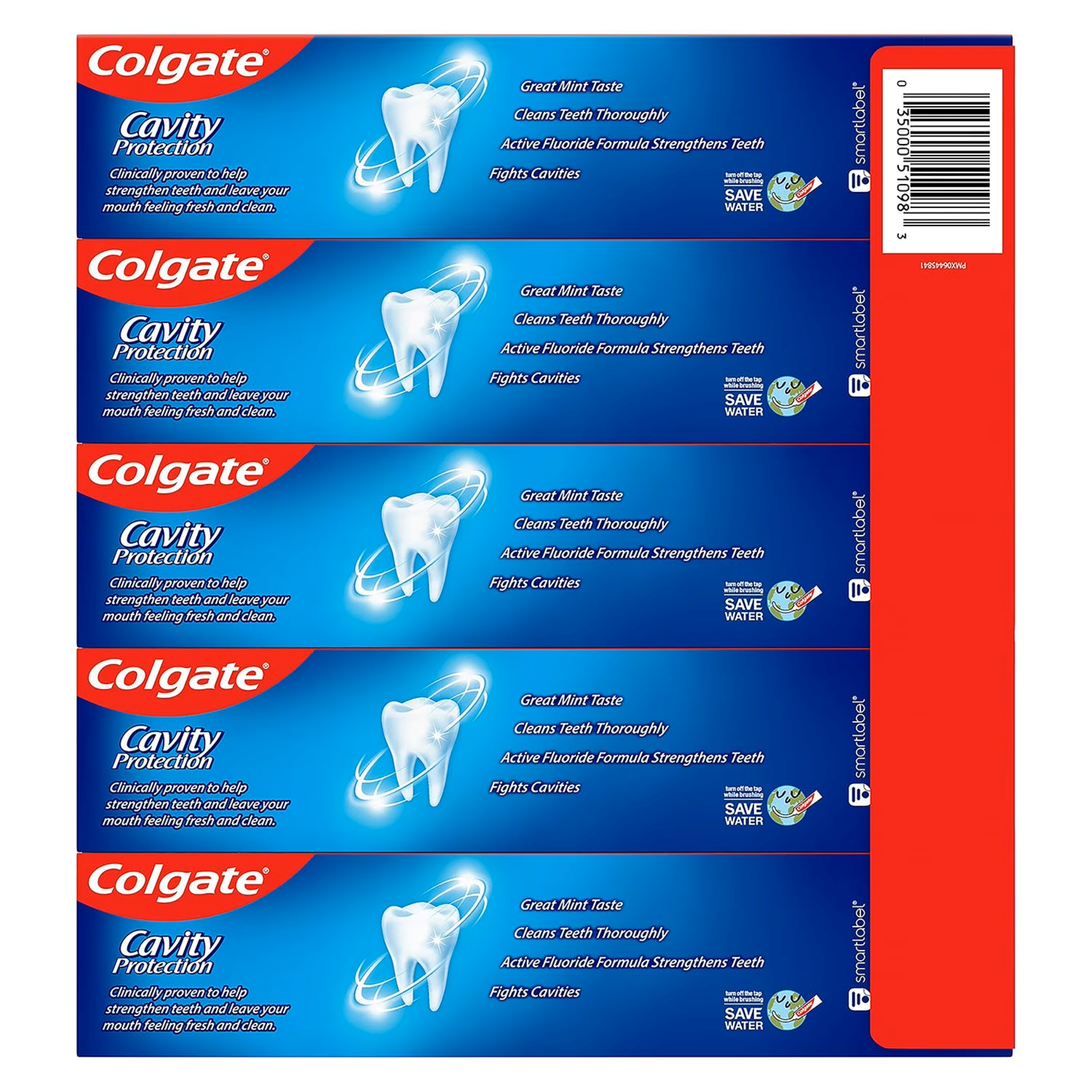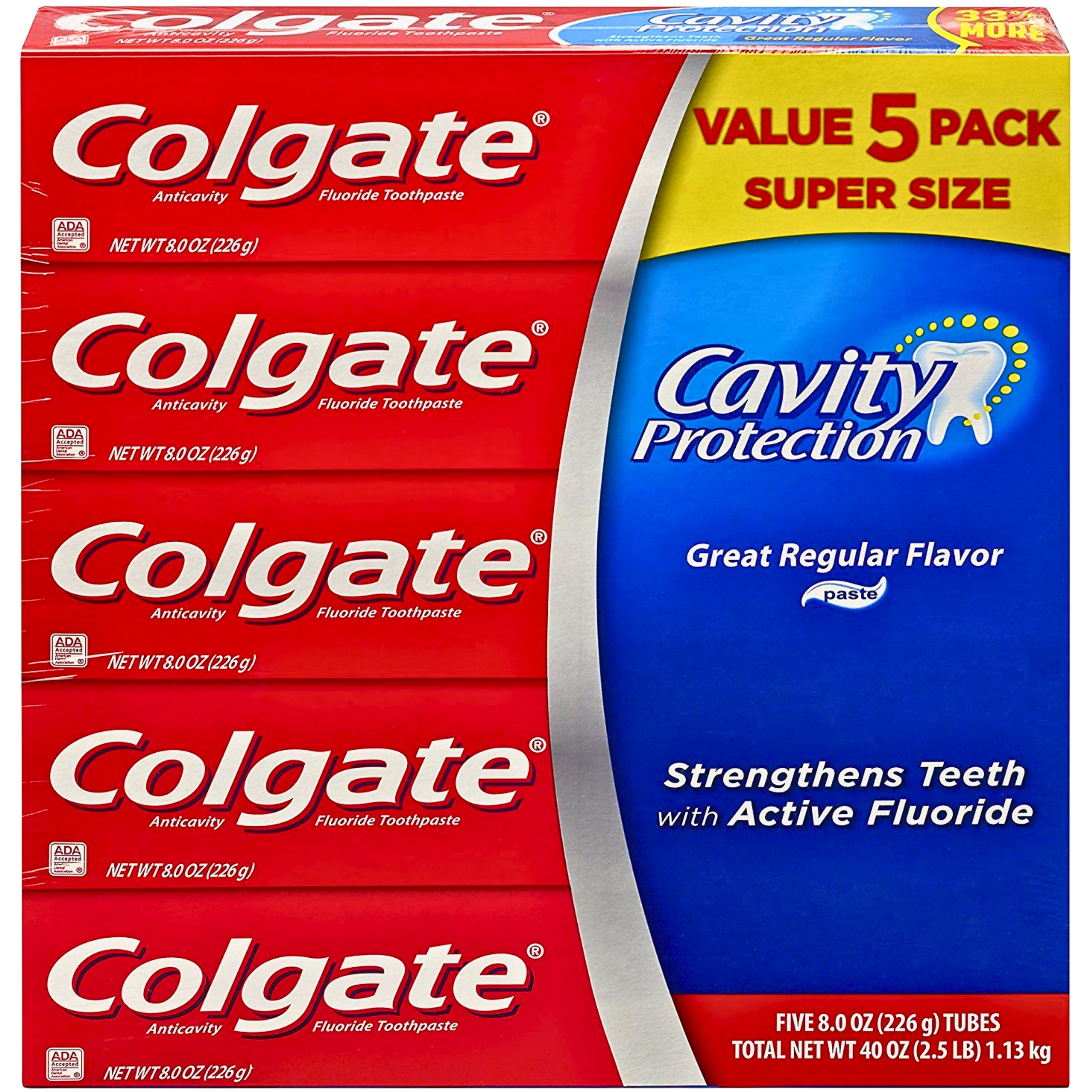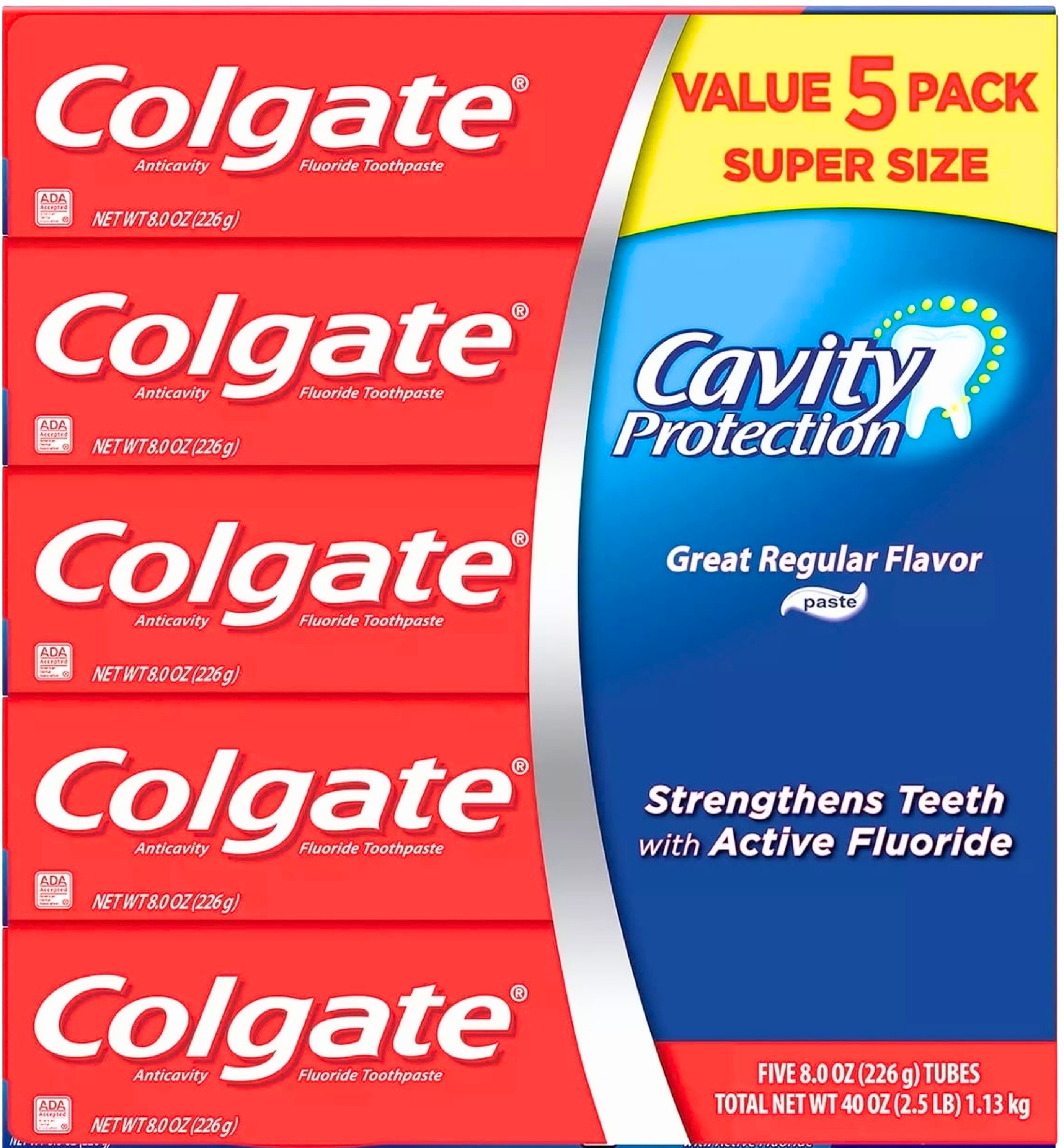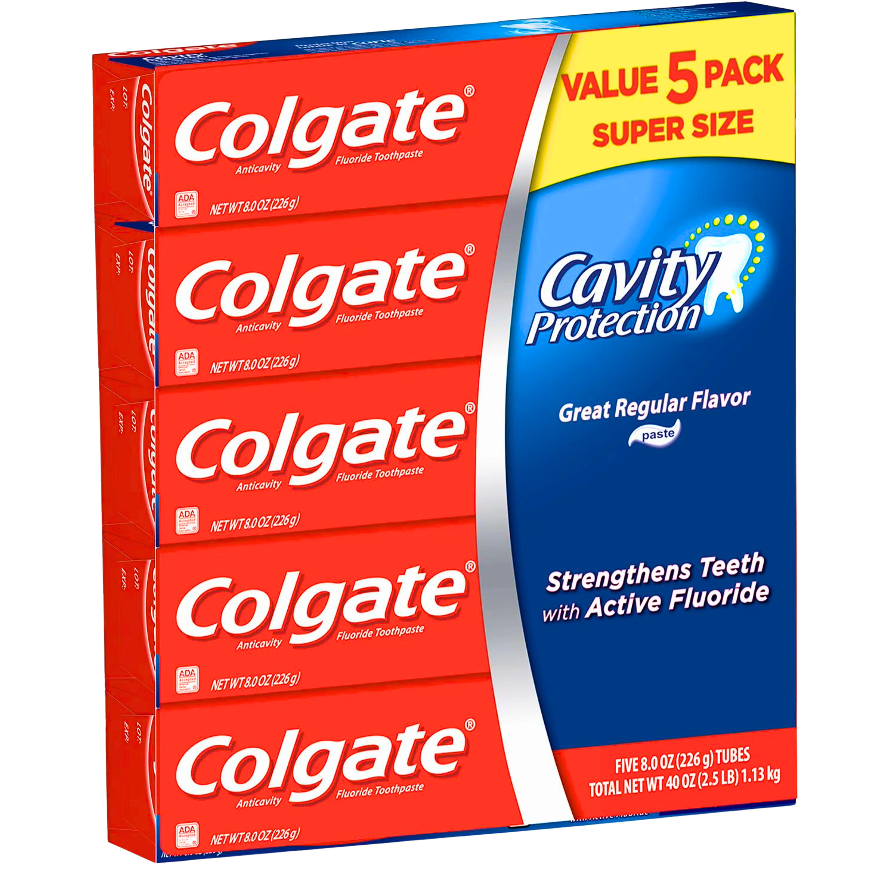 Elevate your family's daily oral care routine with the ultimate value and trusted protection of the Colgate Cavity Protection Fluoride Toothpaste Super Size 5-Pack. This exceptional bundle provides not just one, but five generously proportioned 8.0 oz (226g) tubes of the classic, regular-flavored toothpaste that has been a cornerstone of healthy smiles for generations. With a total net weight of 40 oz (2.5 LB), this convenient multi-pack ensures your household is always well-stocked, providing continuous, reliable dental defense and an unwavering commitment to a brighter, stronger, and healthier smile for every member of your family.