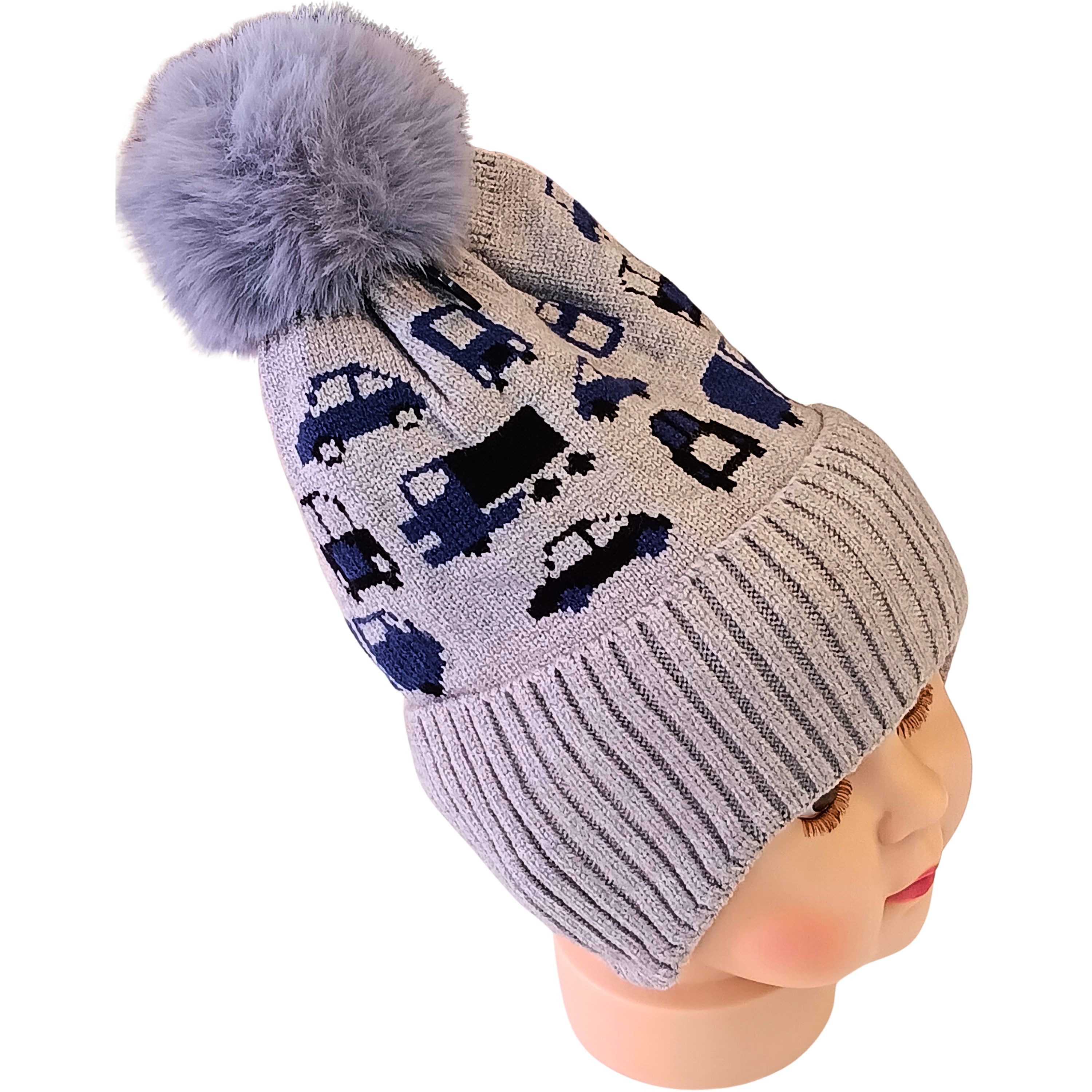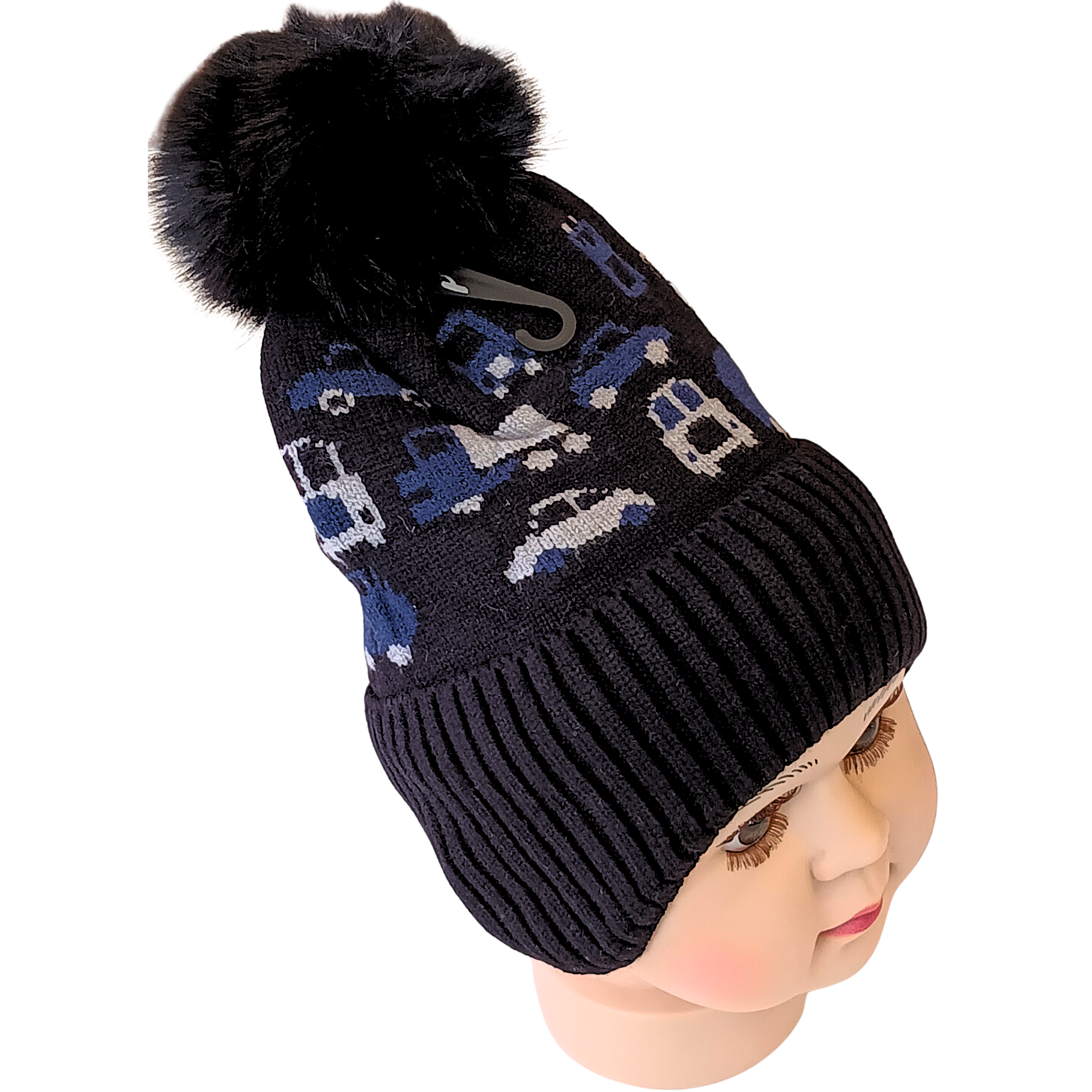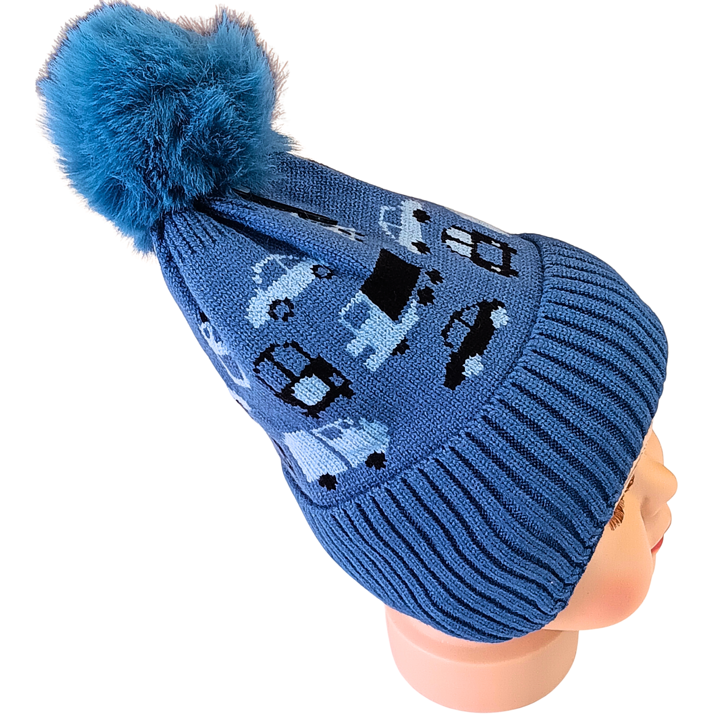 - High-Contrast Vehicle Pattern: The eye-catching knit design showcases different cars and trucks in contrasting colors (like the white, black, and light blue on the Navy hat), stimulating visual interest and imagination.